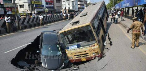 When tunnelling work is in progress in some sections, the sand weakens in some sections leading to sudden road cave-in.
