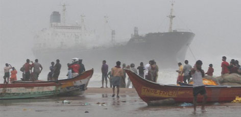 One sailor was killed and five were feared dead after a large oil tanker beached off the Chennai coast as the cyclone churned the sea waters.