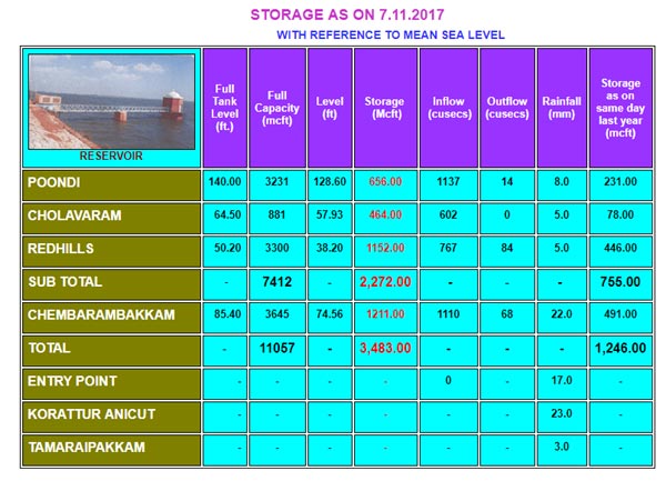 Chennai Reservoirs water level as on November 7, 2017.