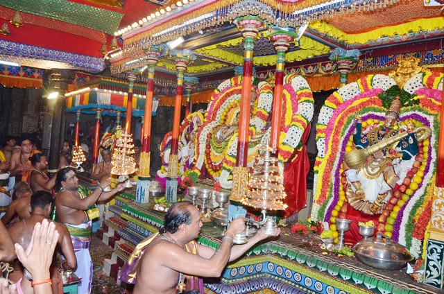 During the night of the 4th day of the grand Thirukkarthigai Deepam festival at Thiruvannamalai, the wondrous Darshan of the deity of the Lord Periya Nayakar being shifted (by the temple staff) and seated on the special carriage of the silver Kamadehnu-Kalpaka Viruksham during the preparations for the special Deeparadhana for the Panchamurthys and then to be taken on a procession.