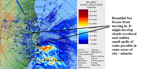 Beautiful Sea breeze front (snake like line seen in radar) moving into the City. It might develop clouds overhead and sudden small spells of rains possible in some areas of city / suburbs. Remember it will rain here and there not in entire part of the city.