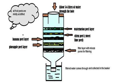 The peels of watermelon, lime, pineapple, and banana are treated with mild acid approximately .1 N to increase their efficiency and making them cation major surfactant so that they absorb the anions present in the water at a faster and countable rate. These peels are placed one above the other in the filter separated at a small distance between each other such that the water flows through the peels without getting stagnant. Contaminated water or the effluent is passed through the filter from a higher gradient which removes all the solutes.