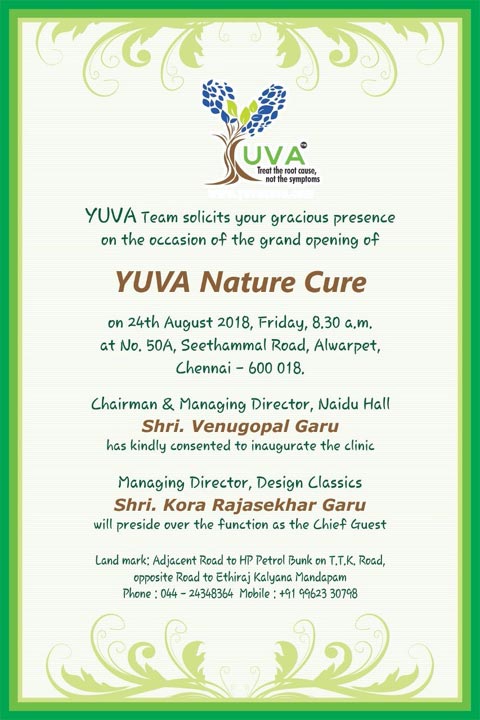 Yuva Nature Care is moving to a new location with a larger space and comforting ambience on August 24th 2018 at Yuva Nature Cure No.50A Seethamal road, Alwarpet, Chennai 600018.