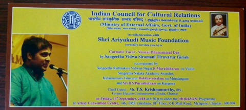 A day in Memory of VEENAI DHANAMMAL CARNATIC VOCAL  PROGRAM by Sangeetha Vidwa Siromani Tiruvarur Girish accompanied by Sangeetha Rathnakara Vidwan Nagai R. Muralidharan on Violin, Sangeetha Nataka Academy Awardee, Kalaimamani Tiruvarur Bakthavatsalam on Mridangam and Sri B S Purushothaman on Kanjira On the Friday, 14th Sep, 2018  at  6.30pm  being held at Arkay Convention Centre, 146, OMS Lakshana, R.K. Mutt Road,  Mylapore, Chennai 600004