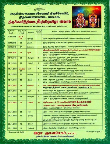 Karthigai Deepam festival schedule at the Arulmigu Om Arunachaleswarar Temple in Tiruvannamalai.