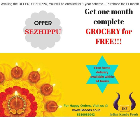 Indian Kombu foods introduced festival offer - SEZHIPPU: Get one month complete Grocery for free.