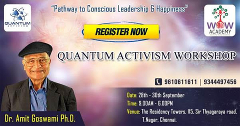 Quantum Vishwalayam is organizing a three-day workshop in association with Wow Academy-Chennai from 28th to 30th September at The Residency Towers, T. Nagar, Chennai where the theme of workshop is �Pathway to Conscious Leadership & Happiness.� Wow Academy or World of Wisdom Academy is a school that is created for people who want to go deeper into their inquiry for evolution of consciousness and understand themselves in a deeper level, thus helping people to discover the intrinsic power with which one becomes healthier, confident individual with a strong will power.