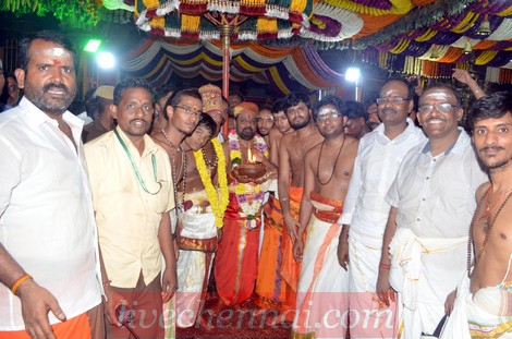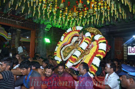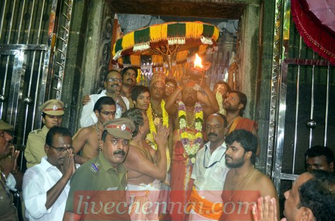 On the 1st corridor of the temple, �Pancha Deepam� (5 holy lamps) were lit in front of the deities of the Sun God and the Moon God. Later, to facilitate �Anegan� beconing �Egan�, the holy �Bharami Deepam� was lit. The lighting lamp was caeeied by the holy temple Sivachariar Murthy.
