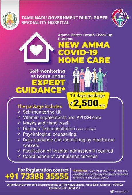 To help people, the government has initiated the Amma COVID Homecare scheme that will assist home quarantines. This scheme is provided under the free full check-up scheme of the Omandurar Multi-speciality hospital. As per this scheme, the home quarantined people will be given a casket that will contain corona treatment and supervision materials at a cost of 2,500. This policy includes providing services of nursing and medical and psychological advice.