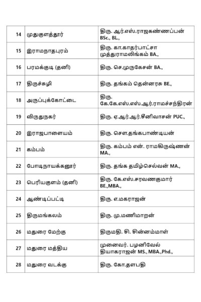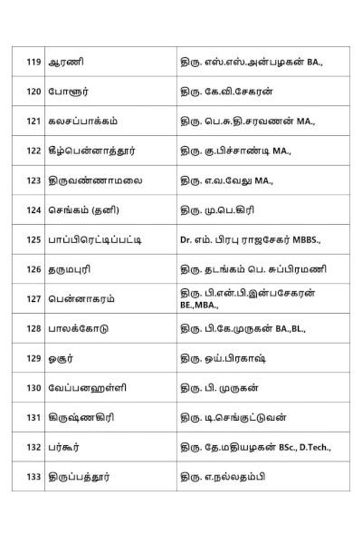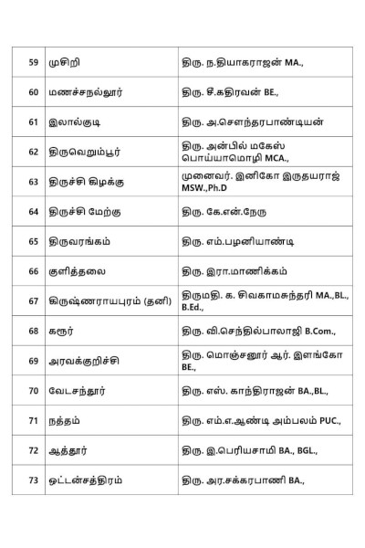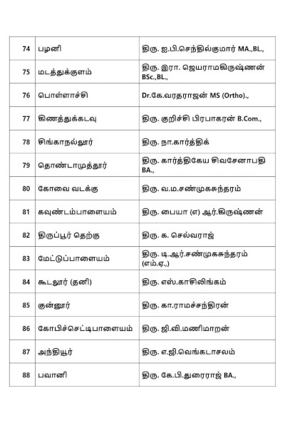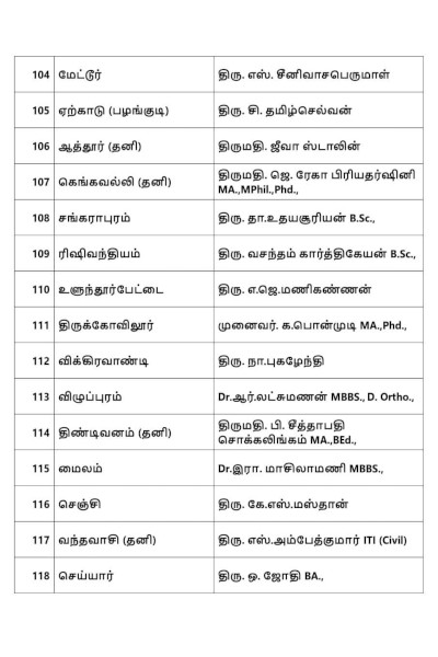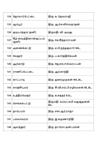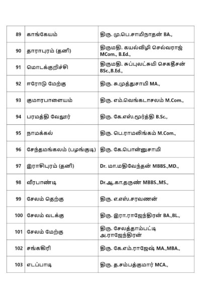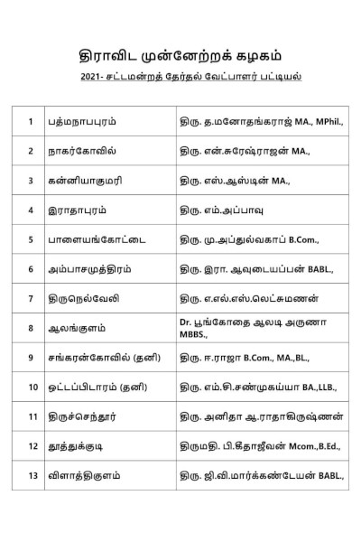 The President of the political party DMK, Stalin, has released the list of 173 candidates contesting in the ensuing Tamil Nadu Legislative Assembly Elections scheduled on 6th April.Here is the next list of the DMK contestants for the Tamil Nadu Legislative Assembly Constituency Elections: