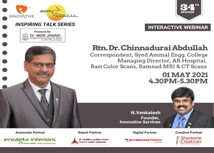 We are happy to present Kanavu Meipada - Inspiring Talk Series. Next Webinar is on 1st May 2021 with Rtn.Dr.Chinnadurai Abdullah, Managing Director Correspondent, Syed Ammal Engg. College,  AR Hospital, Rasi Color Scans, Ramnad MRI & CT Scans.