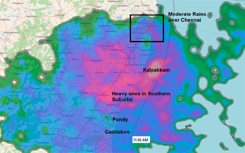 - Moderate rains cover Chennai city and bulk of the heavy ones are in Southern Suburbs to Pondy belt. Steady rains will be seen in City at rate of 5-15 mm/hr intensity rains and variable at times. Cheyyur - Kalpakkam belt is getting smashed with good rains.