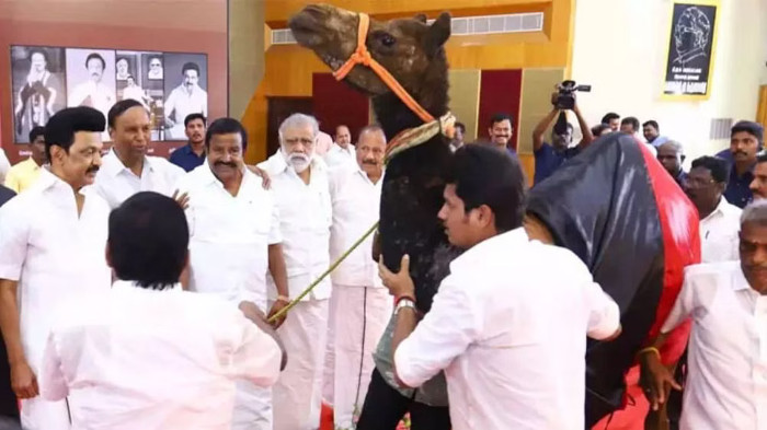 Today, the chief minister of Tamil Nadu Mr. MK. Stalin is celebrating his 70th birthday. On this special day, a special meeting was arranged by the party members so that the volunteers could meet the chief minister and convey their wishes.  A man gifted a camel for the 70th birthday of the chief minister. This took many by surprise. Point is that earlier the CM had received gifts like goats and cows etc