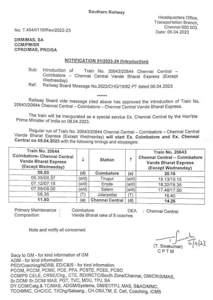 The Vande Bharat Express, one of India`s fastest and most modern trains, has begun its operations between Coimbatore and Chennai. The train left Coimbatore at 6:00 am, and it is expected to reach Chennai at 1:00 pm, covering a distance of 545 km in just 7 hours. The train will make stops at Jolarpet, Salem, Erode, and Tirupur railway stations.