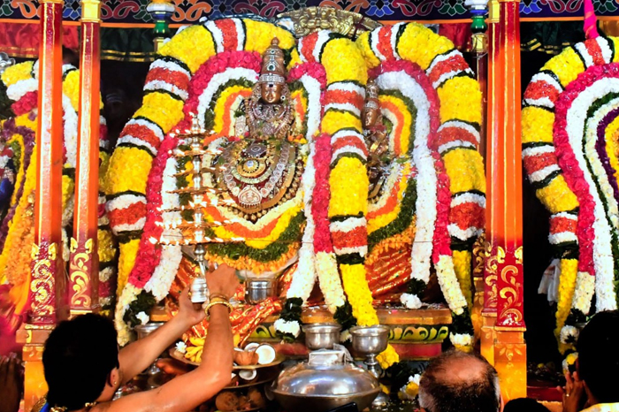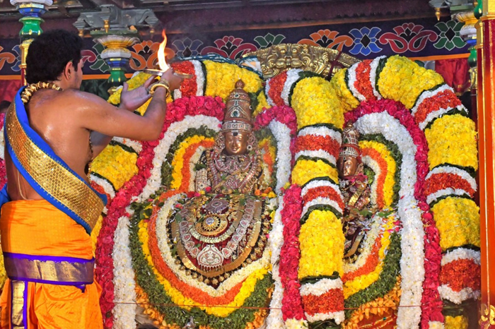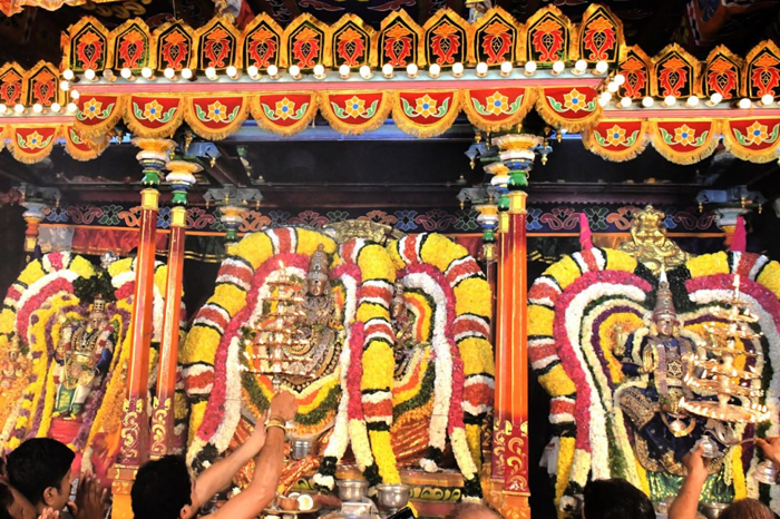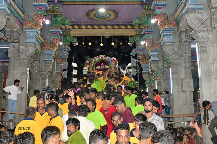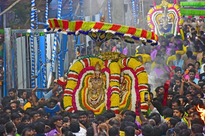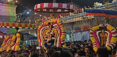 On the 5th night of the grand Thirukkarthigai festival in progress in a grand manner in the Thiruvannamalai Lord Arunachaleswarar temple, the deities of the Lord on the carriage of Rishabha (sacred bull) and the deity of Goddess Parasakthi Amman on the silver Kamadhenu (sacred cow), the deity of Lord Vinayaka on the carriage of Mooshika (sacred mouse), and the Lord Muruga and His Consorts Valli and Deivayanai on the carriage of silver peacock, and the deity of Lord Chandikeswarar on the carriage of silver Rishabha (sacred bull) were carried on procession across the corridors and streets of the temple.