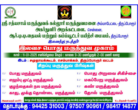Sri Sathya Sai Medical College Hospital, Ammapettai, in association with Agarthulir Foundation, Chennai, and R.T.D. Tailoring and Computer Training Centre, Thiruporur, is conducting a Free General Medical Camp.