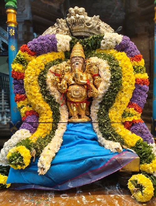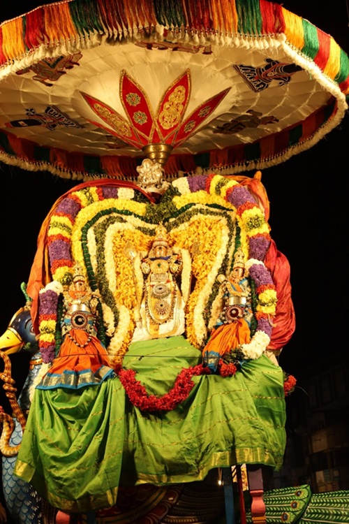 On the first day of the festival, the Panchamurthys were carried on a procession on Mooshikam (mouse), Peacock, Silver Ahikara Nandhi, Hamsam and Simham (lion) respectively around the temple corridor streets offering Darshan to a large crowd of devotee