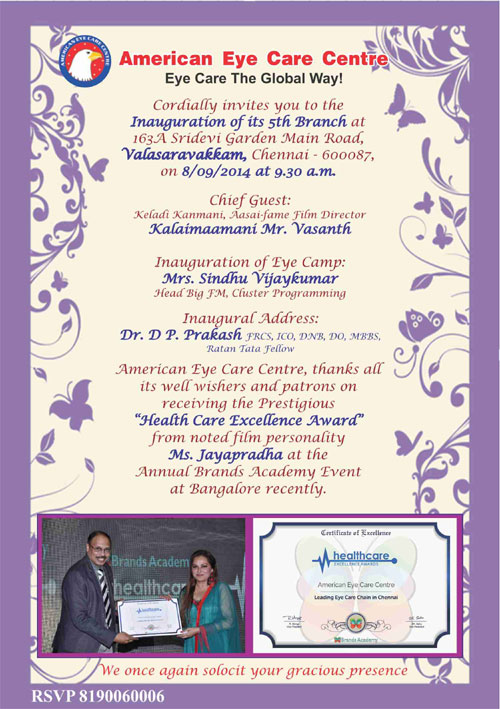 American eye care centre inaugurates its 5th branch at 163A sridevi garden main road,Valasaravakkam, Chennai on today 08.09.2014 at 9.30 am.
