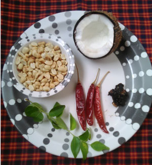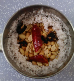 - Add salt, groundnut, dry red chillies, and tamarind and grind it together with coconut by adding little water