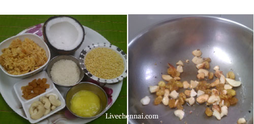 Heat 1 spoon of Ghee in a pan and roast the cashew nuts and dry grapes and remove it in a plate separately.