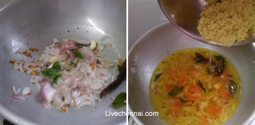 Heat oil in the kadai and add mustard seed, urad dal and Bengal gram into it. Once its colour turns brown add the smashed ginger and garlic and add the curry leaves and saut� well.