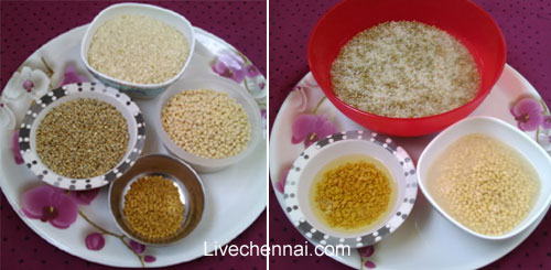Wash boiled rice, raw rice and pearl millet thoroughly and soak in water for about 3 to 4 hours.