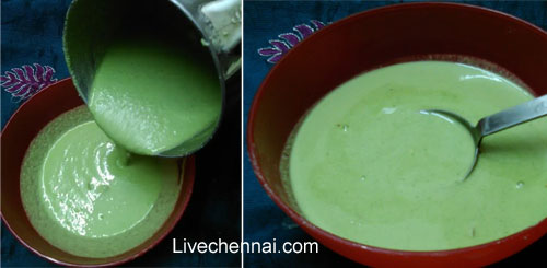 Add the Mudakathan leaves, red chilli and garlic also in the end and grind it to a smooth paste. The consistency should be that of dosa batter consistency. The Dosa batter will be in a lovely light green colour..