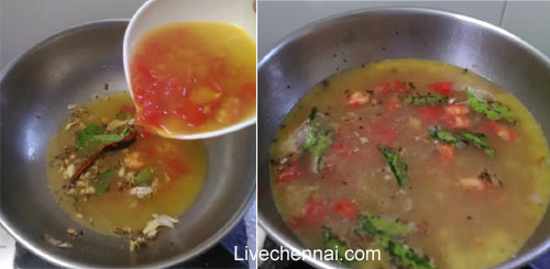 Add splinted red chilli and add the grinded Rasam paste into it.