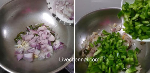Now add the chopped onion and the capsicum. Saute it well for about 5 minutes. Once it gets boiled well, add the chopped tomato. Saute it until the tomato shrinks and the raw smell leaves.