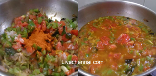 Then add the required salt, turmeric powder, Sambar powder and mix well.