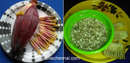 - Clean Vazhai poo thoroughly and chop it in to small pieces. Add 1 spoon of curd to a bowl of water immerse the chopped banana flower in it.