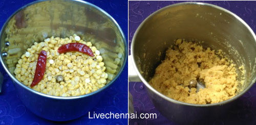 - Drain water from channa dal and grind it in a mixer along with ginger (remove its skin off) and red chilli, salt, fennel seeds to a coarse paste without adding water.