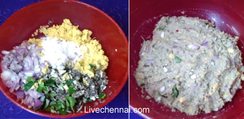 - Then transfer it in a mixing bowl and add chopped Vazhai poo, onion, curry leaves and coriander leaves and mix well.