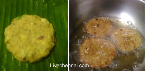 - Then deep fry it, in a tawa of cooking oil. Always keep the stove in low flame, while deep frying the vada.