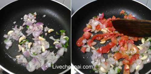 Heat the pan with 2 spoons of oil and add minced garlic, splinted green chilli, curry leaves and onion. Saute it well until the onion colour turns golden brown.