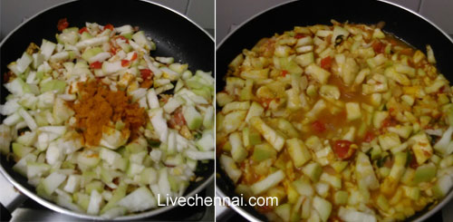 Now add the chopped bottle gourd, saute well and add the soaked moong dal, turmeric powder, sambar powder and the required salt.