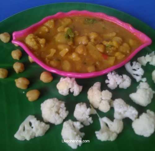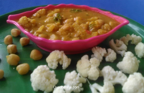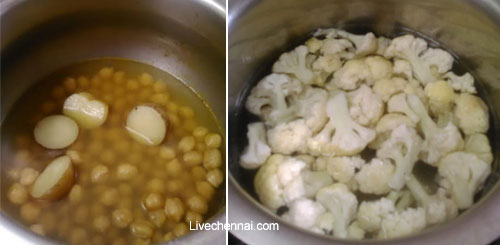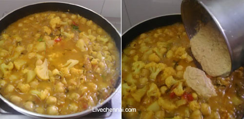 As we already add salt while boiling cauliflower and white channa, now add the required measure of salt and add required quantity of water.