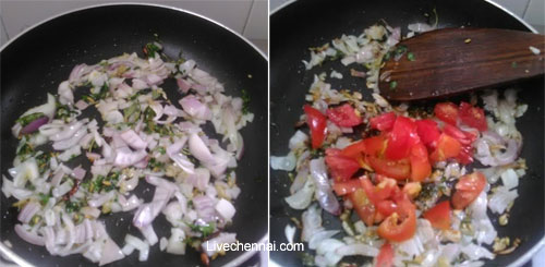 Then add chopped tomato and saute till the tomato gets shrinks and the raw smell leaves.