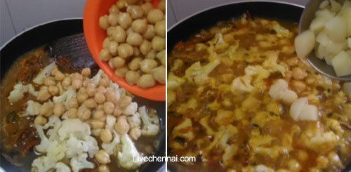Then add the drained cauliflower pieces, smashed potatoes and the boiled white channa into it and stir well.