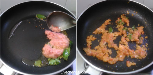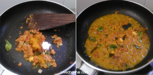 As we are grinding raw onion and tomato, we need saute it well in oil until the raw smell leaves; it will give nice aroma to the dish, else the masala will be slightly bitter in taste.