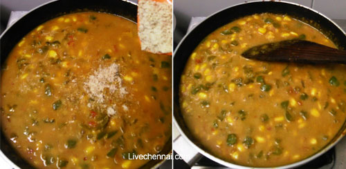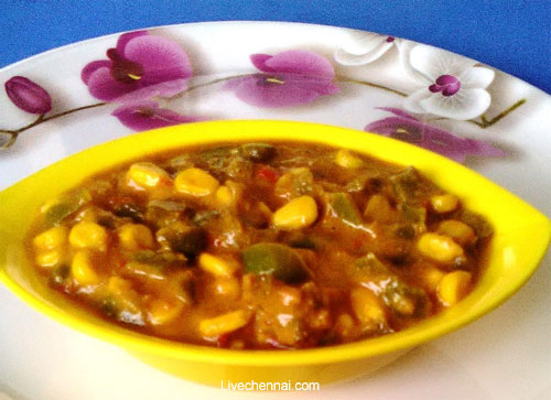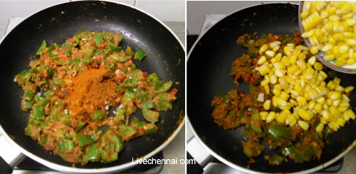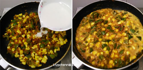 - Mix � tsp of corn flour with � cup of milk separately and drop it on top of the corn and capsicum content. If at all needed you can add the required quantity of water.