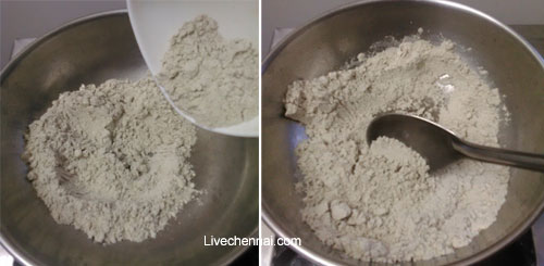 Dry roast Kambu/Bajra flour in a pan. Be sure not to burn the millets. Remove it from the heat once nice aroma comes out from it and the grains turn crispy. Allow to cool completely.