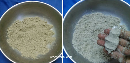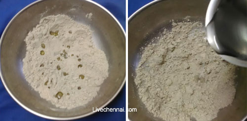 Transfer the mixture to a mixing bowl. You can add a spoon of dry roast raw rice flour for better consistency. But it is completely optional. Add a spoon of ghee, a pinch of salt and mix it well by sprinkling water little by little.