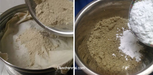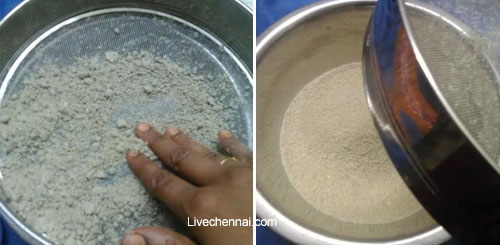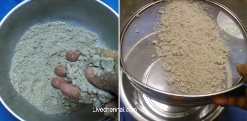 While preparing the puttu flour using either raw rice, Ragi and Kambu, in the procedure of sprinkling water on the flour, there may be some lumps there. It is advisable to sieve the wet flour using the sieve, so that the flour completely free of lumps, else while steam cook thehe flour the lumps remains uncooked.