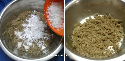 Then open the lid, transfer it to a mixing bowl and add powdered sugar, grated coconut and Elachi powder and mix well.