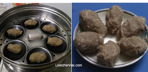 Steam cook the we flour mix in Idli pan (using cotton cloth) for about 5 minutes.