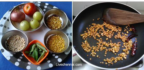 Heat pan with a spoon of oil and add Urad dal, Toor dal, Channa dal and saut� well until dal turns light brown and then add red chilli and keep aside.