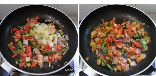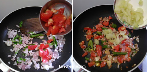 Again heat the same pan with 1 spoon of oil and add chopped onion and curry leaves. Saut� well until onion turns caramel brown and then add chopped tomato and amla. Saut� well for about 2 minutes and then switch off the flame.