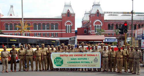 Morethan 300 members of Chennai Ciity Home Guards created an awareness program for public interest on Global Warming on the eve of World Environment day at 4 major traffic intersections in the city, Viz, Chennai Cental, Spur Tank Road Junction, Spencers Signal, and Egmore Station Junction. Motorists were adviced to switch off the vehicles while waiting for the signal to conserve petrol and also to save the environment. Pamphlets on how to stop global warming were also distributed to the motorists.