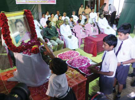 More than 1500 students observed two minutes silence as a mark of respect to the late teacher and paid floral tributes to the portrait of Maheswari, kept at the Auditorium. The studentďż˝s was moved to tears as they lined up to pay homage to the teacher, offering fl oral tributes.